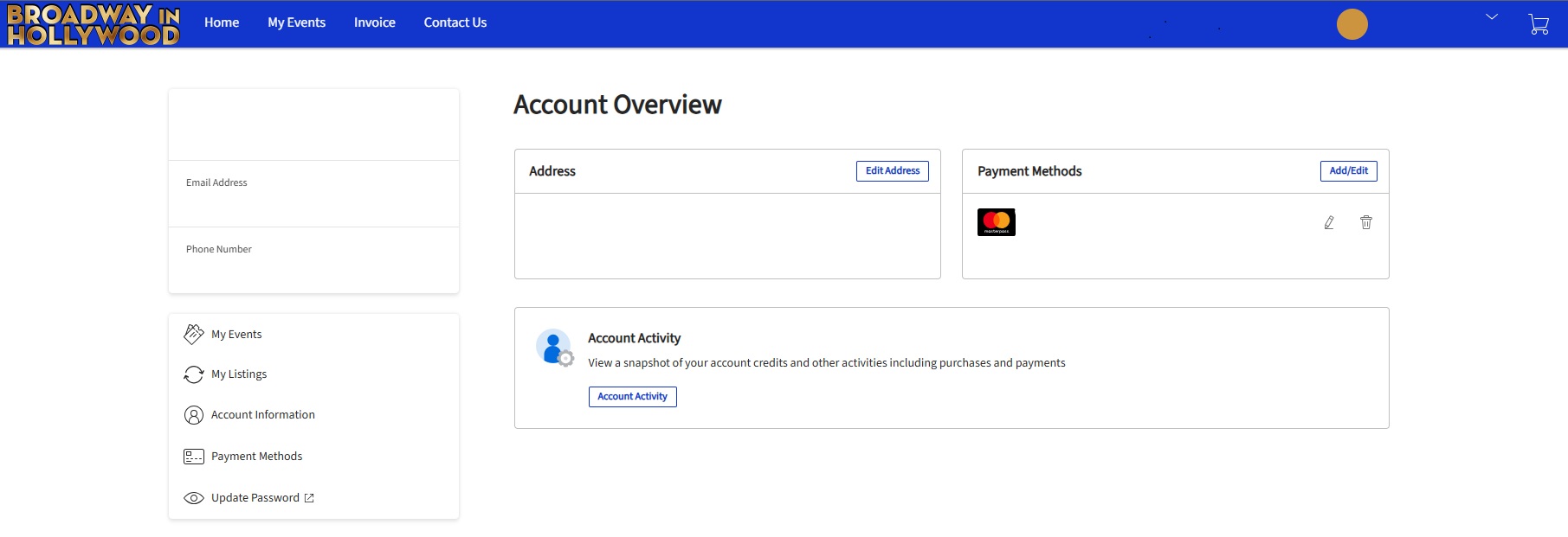 ⭐ Tip: From here you can view and make changes to your account like update your stored payment methods and contact details, update your password, and more.