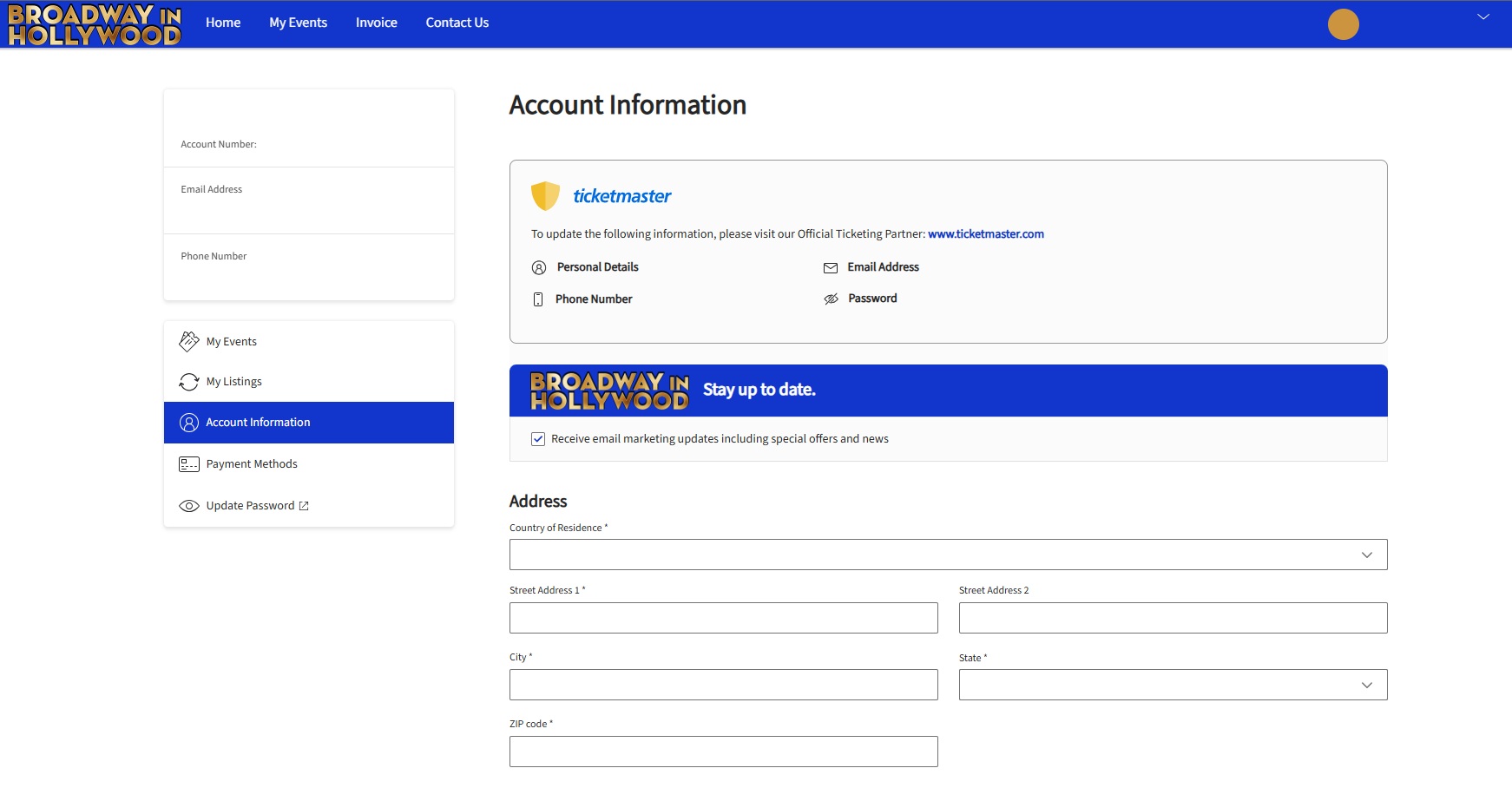 To update certain account details like email and phone, please visit our official ticketing partner: